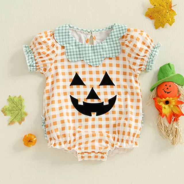 Make your baby girl’s first Halloween extra special with this cute pumpkin face plaid romper. Designed with a playful pumpkin print and classic black-and-orange plaid, this short sleeve jumpsuit brings the perfect mix of festive charm and everyday comfort. Whether it’s for a Halloween party, family photos, or just a cozy day at home, this romper will have your little one looking picture-perfect.